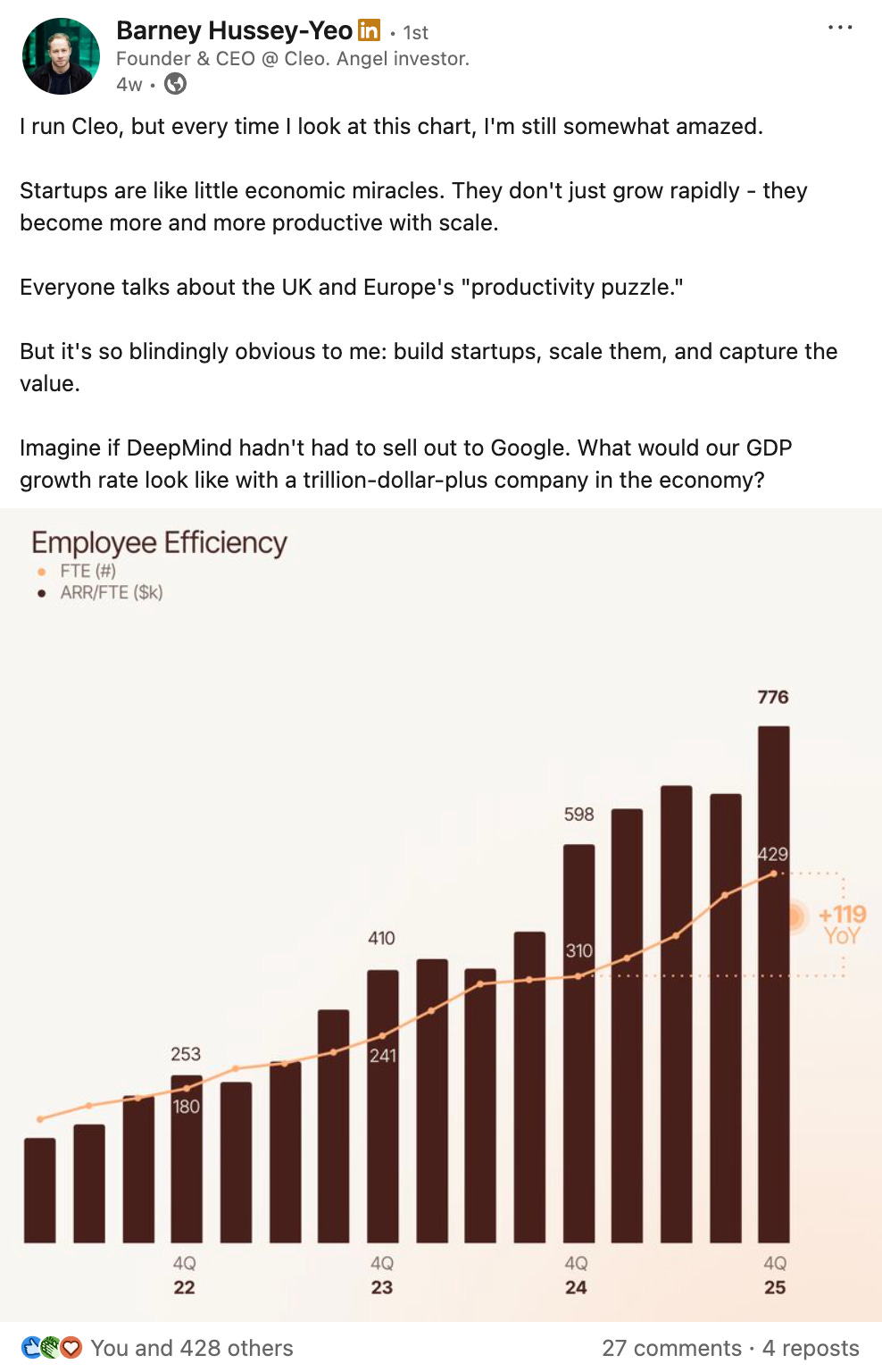 It’ll sound callous, but the massive rounds of redundancies coming, when we look back, will seem like the managed burn of the Third Industrial Revolution, clearing old brush to allow more fire-adapted plants to grow. Some fire-resistant old trees will survive through it, too. I’m optimistic that it’ll also drive a new wave of economic growth - at least in nations that allow the burn. Some of that will be new digital roles. Some of that will be a transfer of workers into critical shortage roles in the community like teaching and care. Today, the U.S. are ahead of the world on this. Their talent moves fast in and out of companies, driving the twin benefits of cross-pollination of skills and ideas, and flexibility to hire marginal roles. For Europe, I’m fearful. Labour laws are already tight. The UK’s have recently tightened. I now weigh more heavily every hire, and will be more cautious and hire fewer people than we might in a looser labour environment. But there is a big opportunity for Europe too. Capital requirements for Opus Babies are much lower, because the largest cost item for any startup is heading to zero. We have a large, technically-inclined graduate base. Our economies are highly diversified.