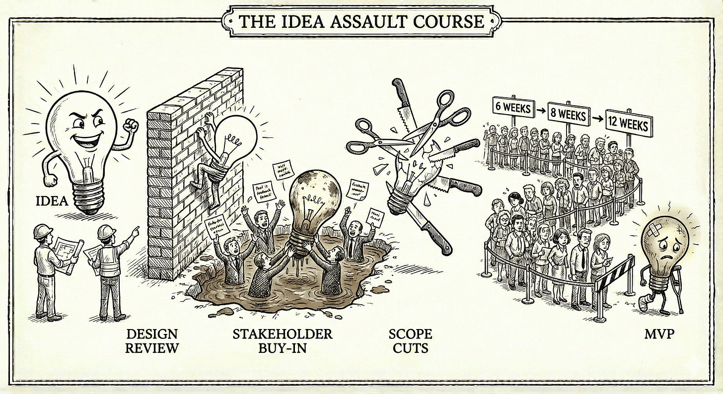 If ‘validated’, whatever that meant, move into the design and PRD phase. Here even in startups, ideas get crushed by committee; tech rules out X, design rules out Y, and suddenly you’re at 20% of the vision because it’s ‘in scope’